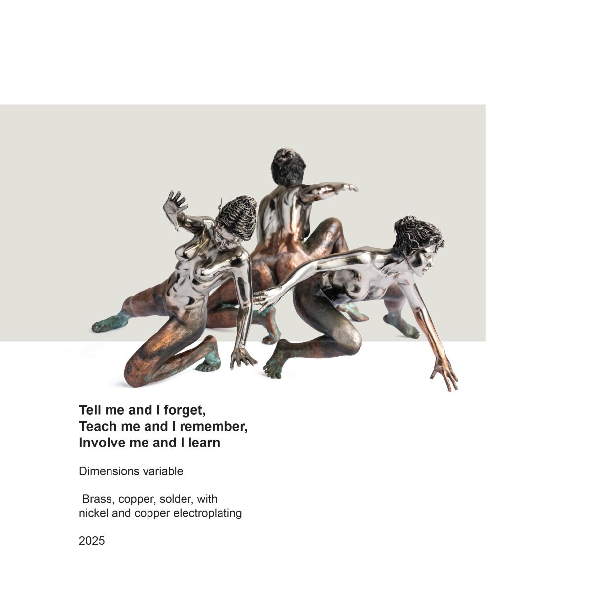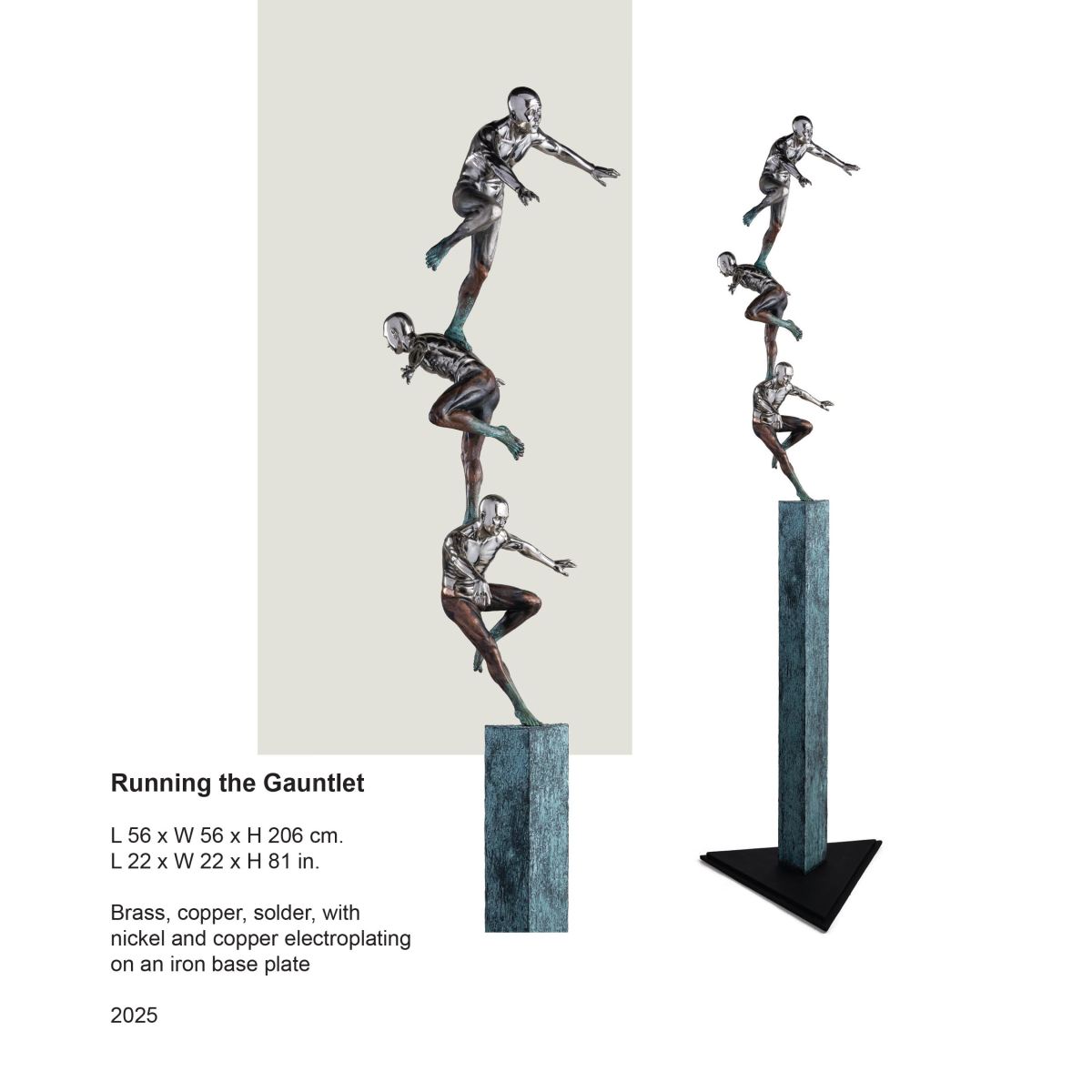 Across a suite of sculptures—balletic figures balanced upon improbably slender pedestals, rotating gears that trace the choreography of bodies in motion, mask-like visages suspended in quiet vigilance, figures in states of contemplative stillness, and an entire gathering of Crucifixes rendered in shifting scales—dela Cruz demonstrates how the body becomes a vessel of unearthly grace. The musculature, gesture, and momentum of each form feel charged, as though the animating breath that moves them originates not from human power but from the Divine. Metal, under dela Cruz’s hands, behaves less like matter than like an extension of spirit.